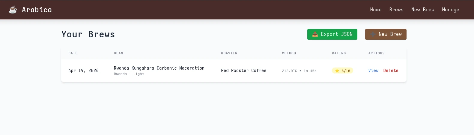 The project that eventually became Arabica started as an idea last summer. I wanted to get better at making coffee and understanding what I liked and why, through the process of logging variables and other notes about brews. There are, of course, tools that exist that provide this exact service, but over the last year or so I've grown increasingly disinterested in using any services that I can't self host (I want to own my data). I decided I wanted a simple brew logging web app that would just contain a form for logging common brew variables (e.g. bean, brewer, grinder, water and coffee amount, water temp) and store them as JSON for easy aggregation and analysis. I planned to run the site off of my home server, and serve it only on my home network.