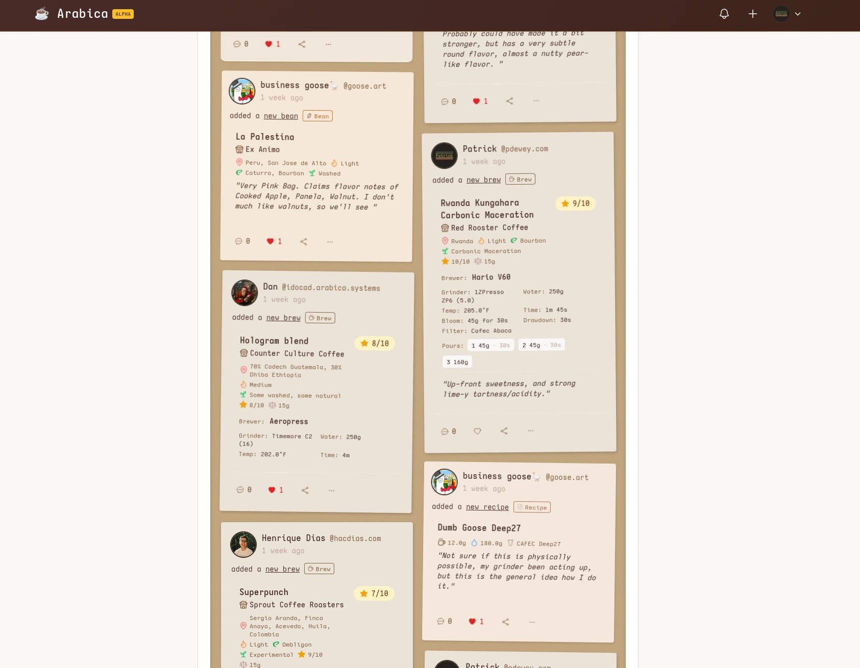 Arabica is a social brew logging site built on the AT Protocol. Today, it lets you log brews, beans, gear, recipes, and roasters, rate brews and beans you've tried, and follow along with what others are brewing through a community feed where you can like and comment on their entries.